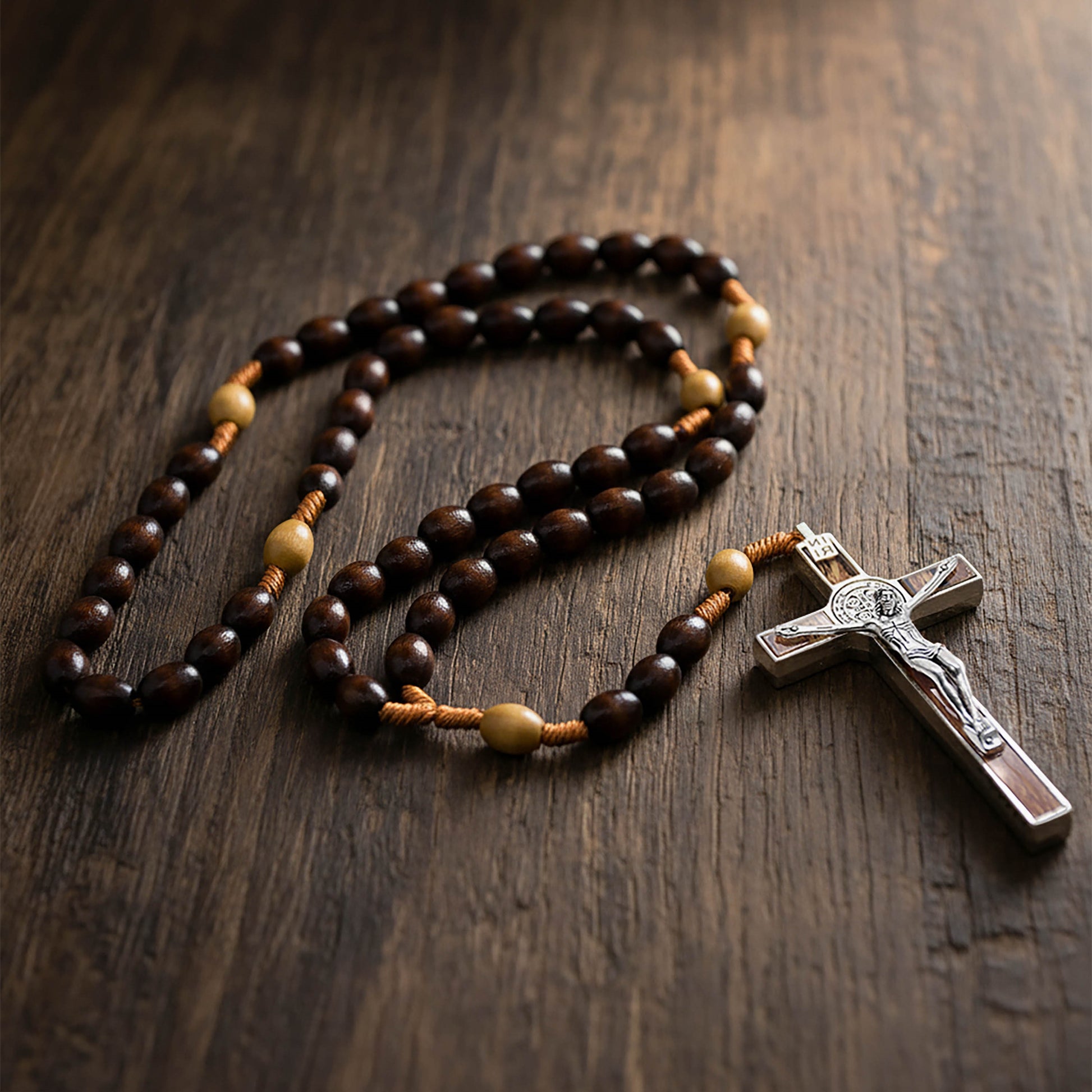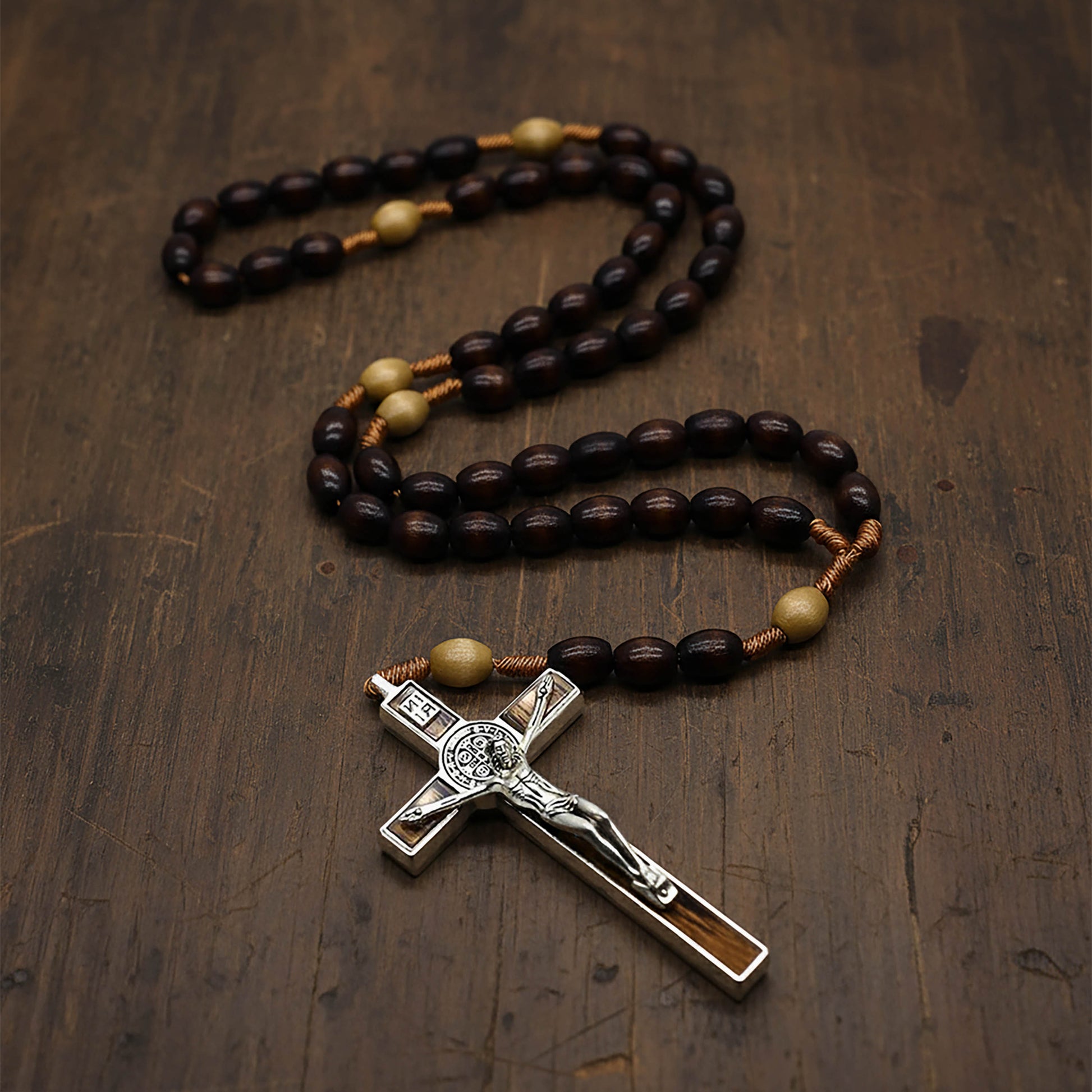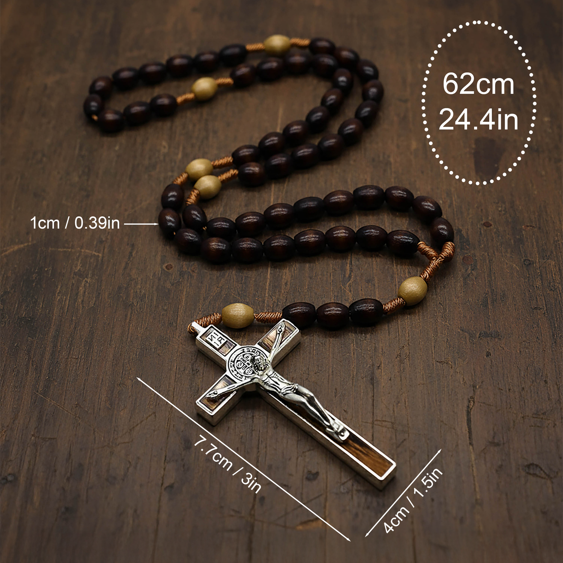• Wooden Rosary St Benedict, Wood Beads Prayer Necklace Rosary Catholic Gift, St Benedict Crucifix Rosary Durable Handmade Rosary Beads, Rosary for Women •